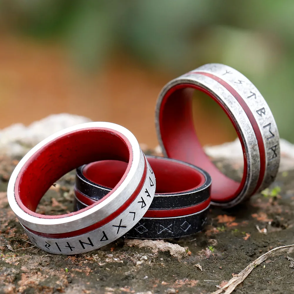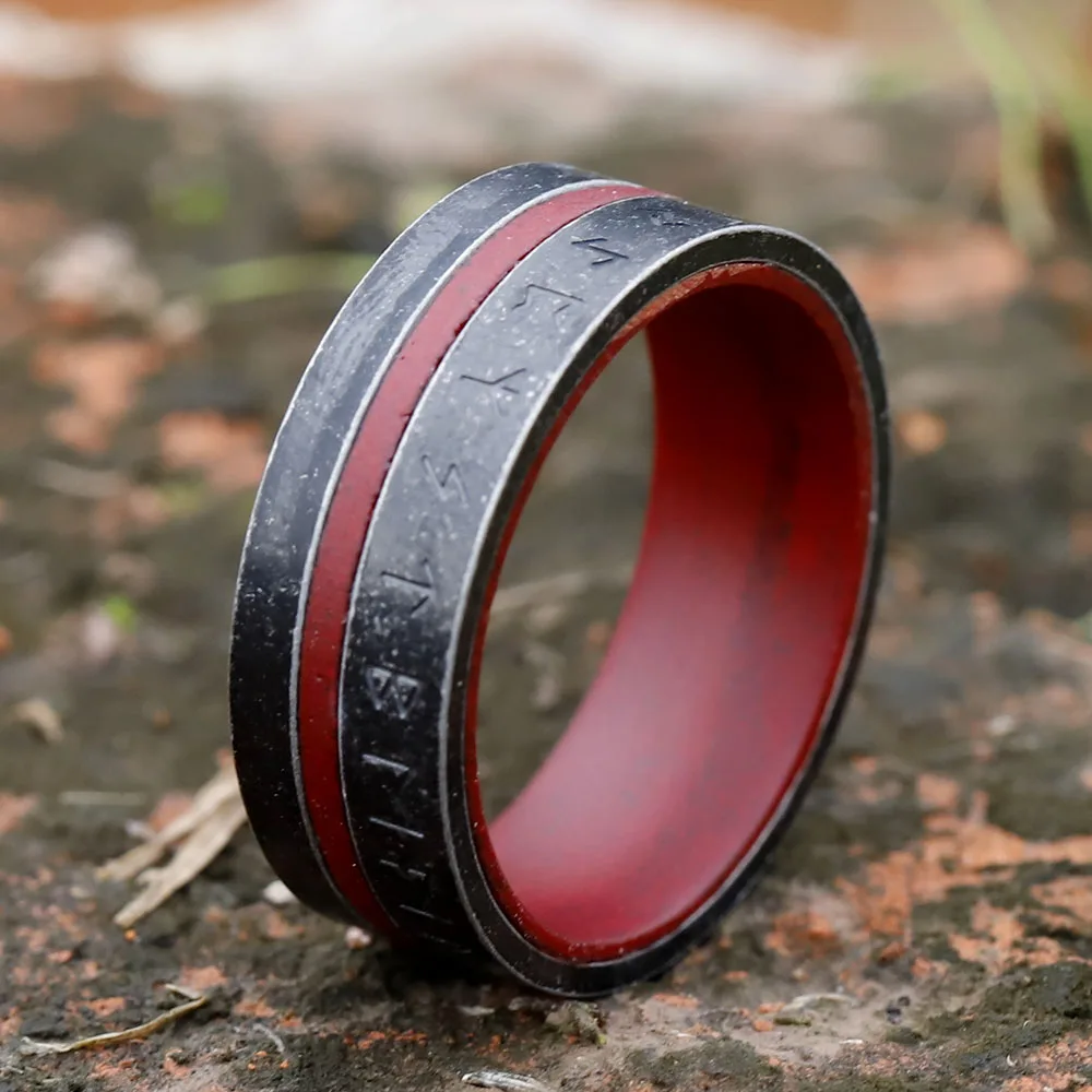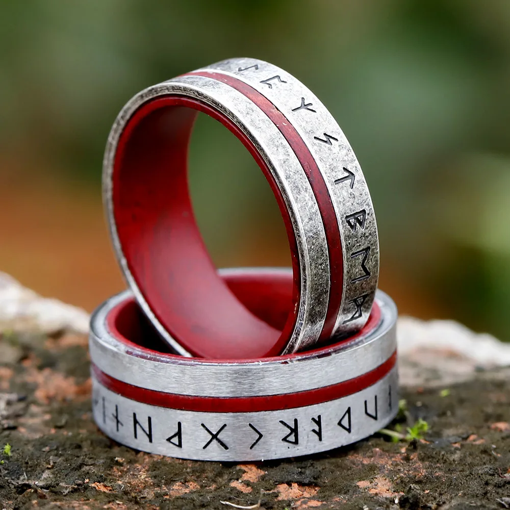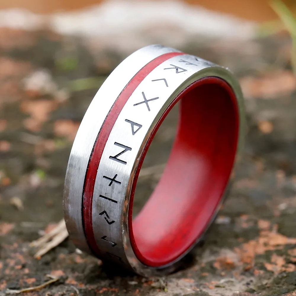 The ring is a story of lineage and prowess. Forged in the fire from Nordic mountains, the design was to be more than just a symbol of strength-it was a promise. The red veneer is symbolic of the warrior's blood line, descendants of fighters that have been through countless battles with their resolute nature. For every rune cut into that ring, there is a tale to be told, a fragment of the ancient wisdom which guided the Vikings across brutal oceans into the frenzies of blood-soaked battles.