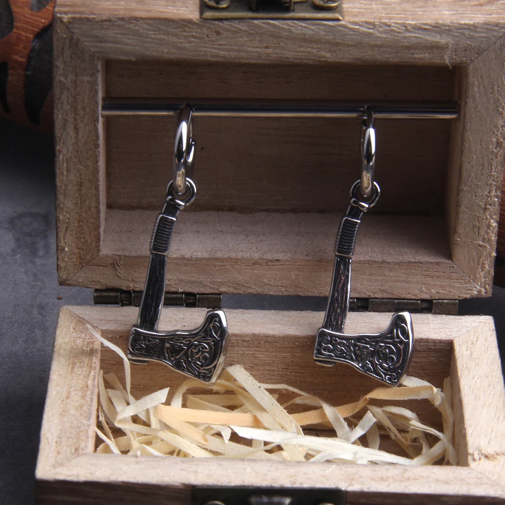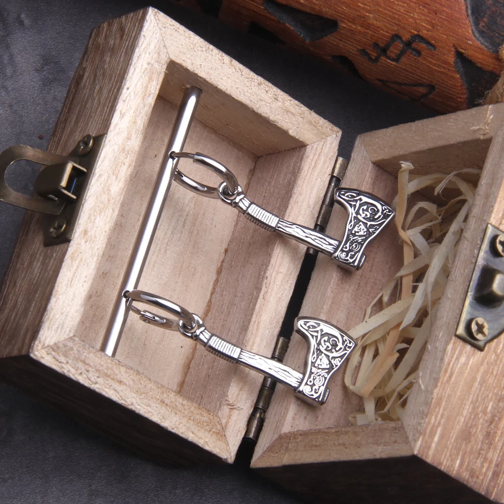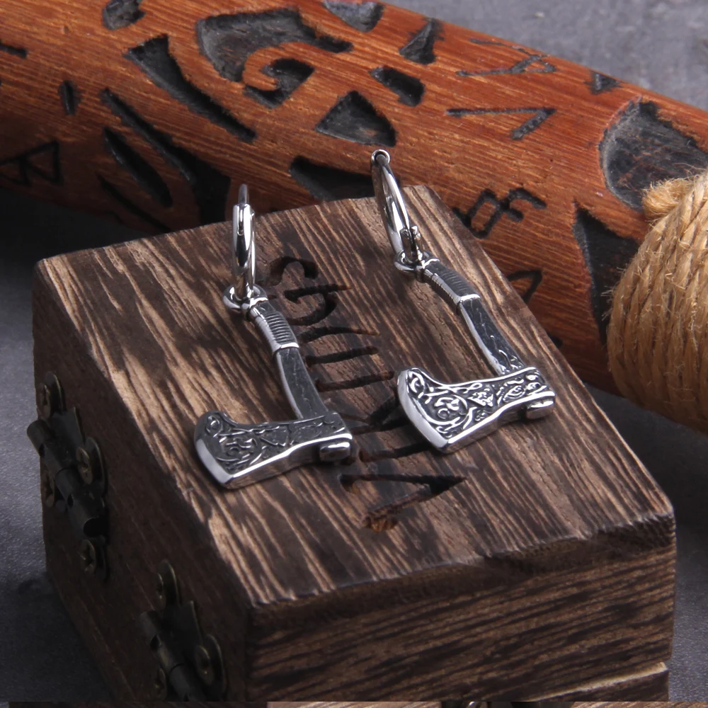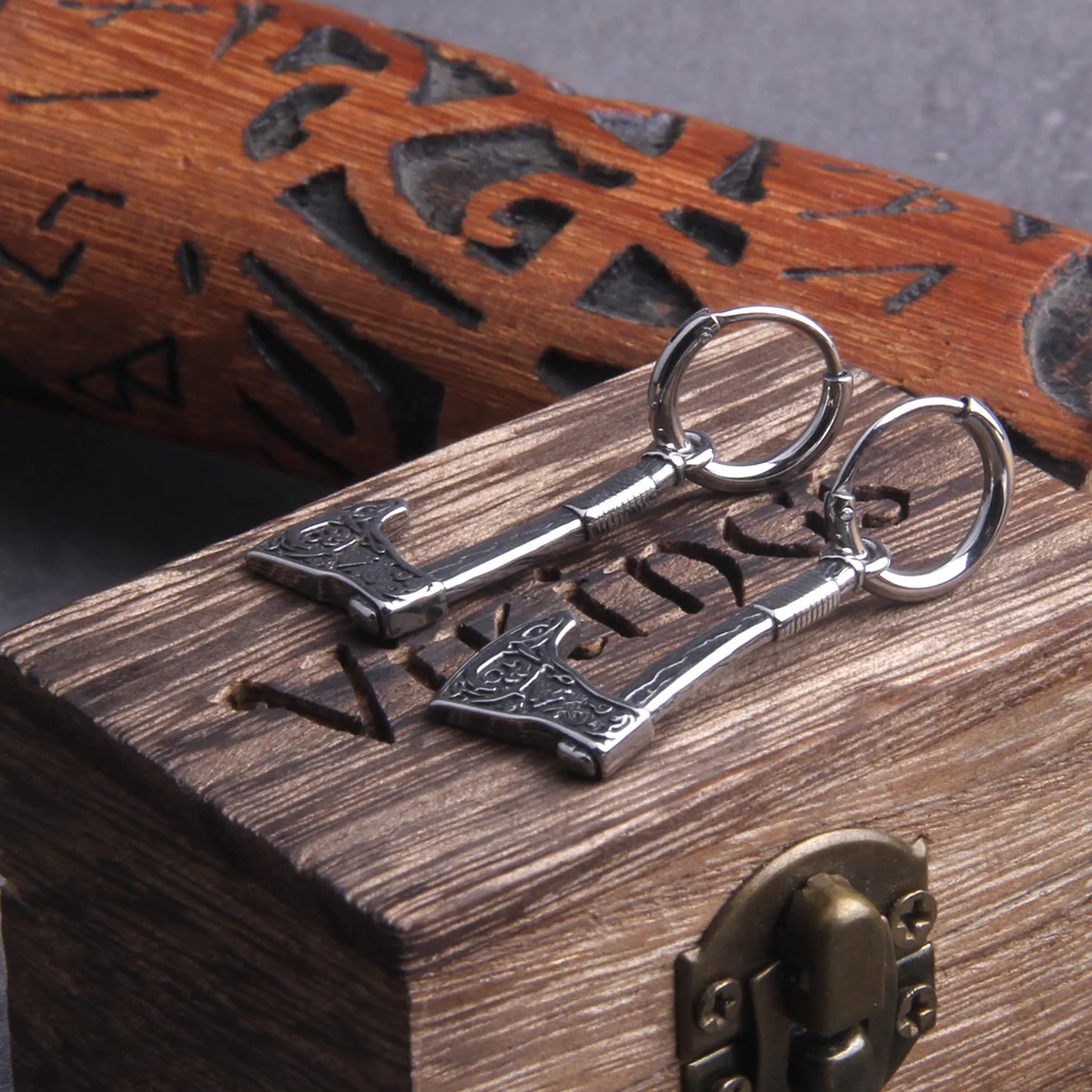 - Design: Features a Viking axe-shaped drop design with intricate rune and Celtic knot engravings, symbolizing power and protection.